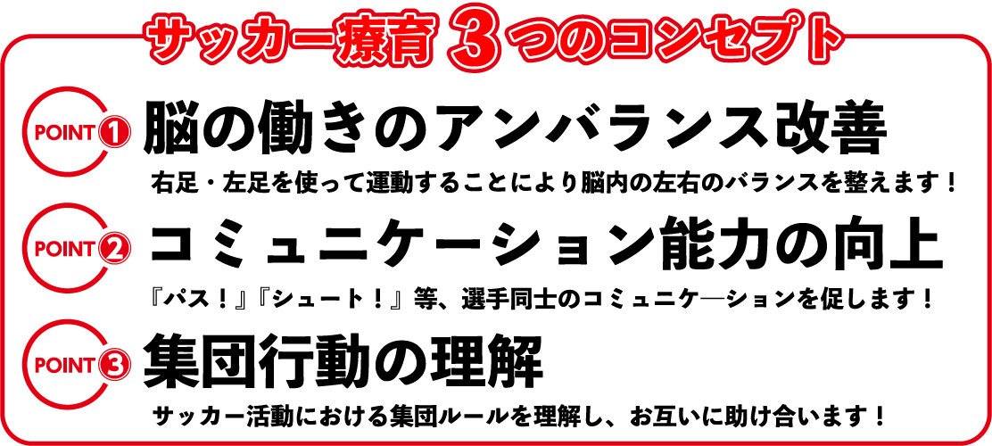 メインの活動は日々のサッカー療育です。 その日のテーマに合わせてトレーニングを行い、トレーニングの最後には必ず試合形式で成果の確認を行います。 ドリブルやパス、シュートなど成功体験を積み重ねることで、心身ともに逞しい成長を観ることができます。